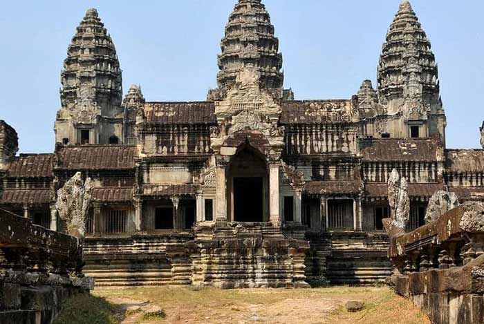 آنگکور وات، بزرگترین بنای مذهبی جهان، در کامبوج واقع شده و نمونهای برجسته از معماری خمر است. این معبد در ابتدا بهعنوان معبدی هندو برای پرستش ویشنو ساخته شد، اما بعدها به عبادتگاه بودایی تبدیل شد. آنگکور وات به دلیل طراحی پیچیده، حکاکیهای دقیق و وسعت عظیمش شهرت دارد. این بنا در قلب مجموعه معابد آنگکور قرار دارد و نمادی از شکوه امپراتوری خمر است.